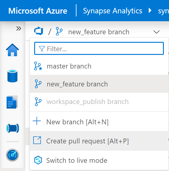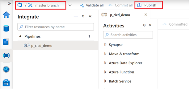 - Back to your Development Synapse Workpace, select the "master branch" and hit the "Publish" button.