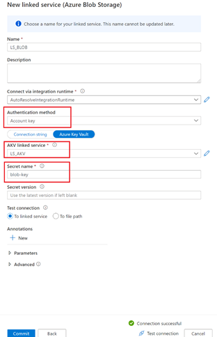 - Navigate to the "Manage Hub" and select "Linked Services" under "External Connections". Create a new Linked Service and choose Azure Key Vault as the connector. Name your Linked Service as "LS_AKV" and specify the Base URL (you can get this URL from your Key Vault Overview page). Before you apply your changes, don't forget to test your Linked Service connection.