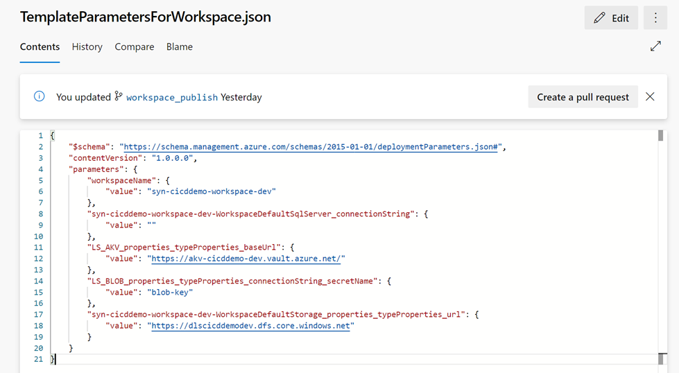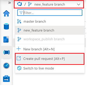 - After completing the pull request, it's time to publish our changes to the Workspace and to generate and save the ARM templates in the publish branch ("workspace_publish").