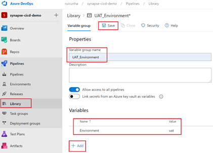 - Create two Variable Groups: one for UAT (UAT_Environment) and another one for PRD (PROD_Environment). During the configuration of these Variable Groups, add a new variable "Environment" and set the value as "uat" and "prd" respectively. Apply your changes by selecting "Save".