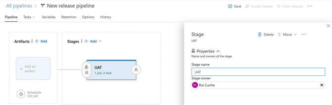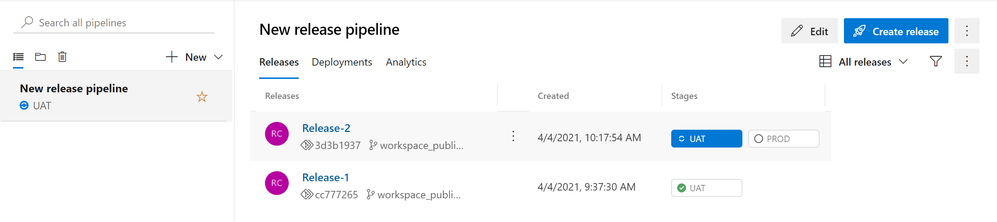 - Click on the “UAT” stage and then select “Create” to create your new release. After creating your release, select "View Releases" and you should now see your new release "Release-1" under the "Releases" tab ready to be deployed. Now you can click on the "UAT" stage name under "Stages" header attribute.