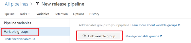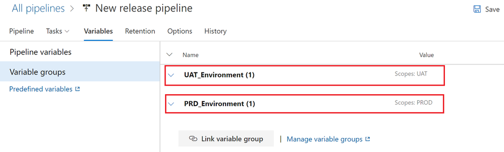 - Now it's time to add variable groups to our release pipeline. This is done by linking the Release Pipeline to the Variable Groups. In this case, you are going to link the new release pipeline to the "UAT_Environment" and "PROD_Environment" Variable Groups. Select the "Variable groups" tab.