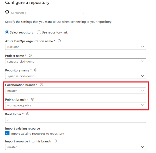 - Provide your "Azure DevOps organization name" , your "Project name" and your "Repository name" (both as "synapse-cicd-demo).