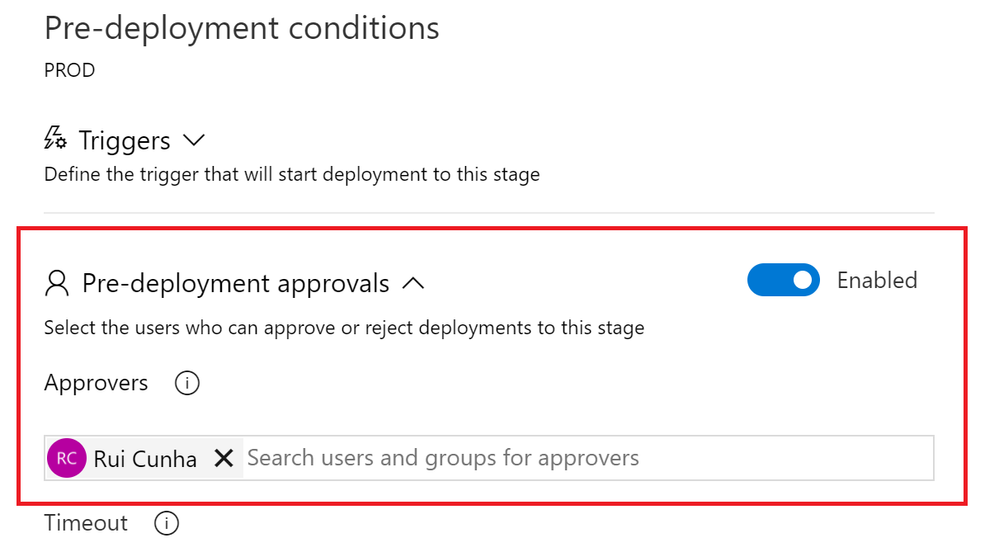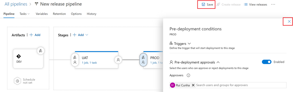 Under "Pre-deployment approvals", specify the user(s) responsible for approving or rejecting the release to PROD environment