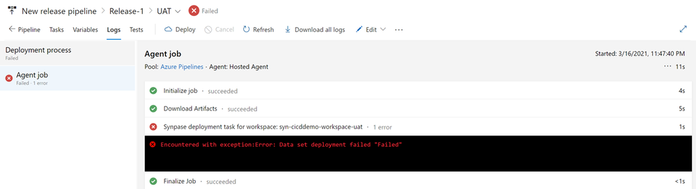 - Keep track of the deploy progress by selecting the “Logs” tab. When the deploy gets finished, you can also download the logs for troubleshooting purposes. The deploy of your first release to the UAT Synapse Workspace will probably result in a similar error like shown in these figures: