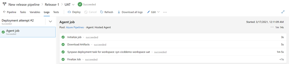 Back to the Azure DevOps Release page, we can hit again the “Deploy” button to redeploy the release. Check the "Logs" tab to confirm that all the steps were succeeded.