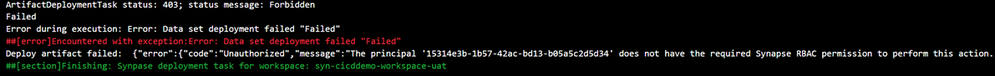 - Most likely this Authorization error is due to missing Synapse RBAC permissions in the target Synapse Workspace (UAT). You need to navigate to the UAT Synapse Workspace "Manage Hub", select "Access Control" under "Security" and "+ Add" a role assignment to the Service Principal of Azure DevOps service.