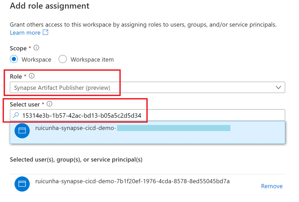- Select the “Synapse Artifact Publisher” role and then copy the Service Principal ID from the log error message and paste in the “Select user”. Make sure the Service principal is selected and then hit the "Apply" but to confirm your changes.
