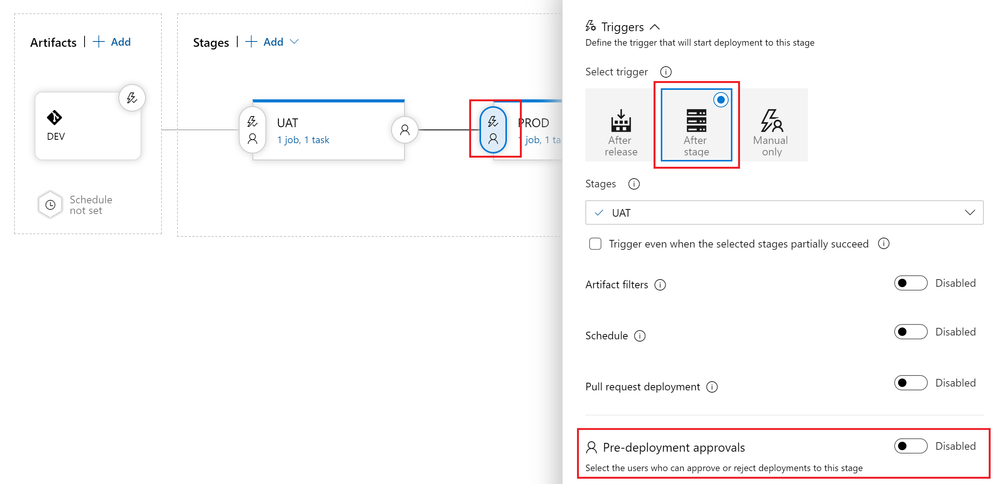 - Now click the "Pre-deployment conditions" icon on the "PROD" stage. To control the release to Production , in this example you will setup the user(s) (release manager(s)) responsible for approving or rejecting the deployment of your new features from UAT to PROD.