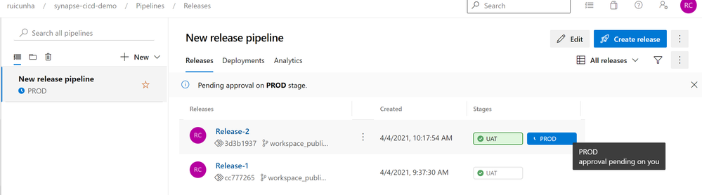 - Hit the "PROD" button and then select "Approve". A few seconds after your approval, the PROD stage will begin the release deployment to the Production Synapse Workspace. Wait a few seconds until you see both stage icons as successful: