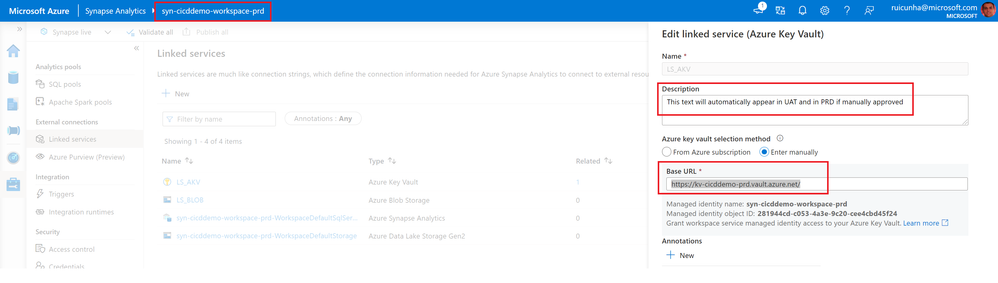 - Now open the Production Synapse Workspace to confirm the deployment of Synapse Artifacts. Select the "Manage Hub" and under "External connections" select "Linked services". Open the Linked Service to Azure Key Vault. You'll notice the Linked Service Description as "This text will automatically appear in UAT and in PRD if manually approved" and you can test your Linked Service connection to the AKV url: "https://kv-cicddemo-prd.vault.azure.net/".