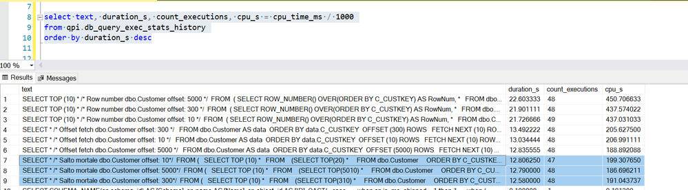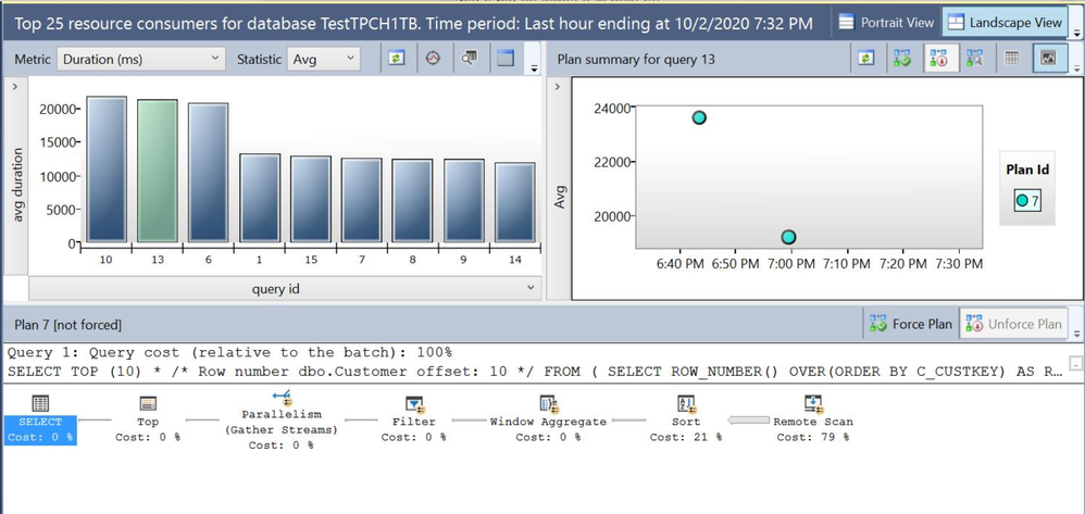 Since OFFSET/FETCH is still not available in Synapse SQL, I have run the test on Azure SQL Managed Instance and the results are displayed in the following Query Store UI: