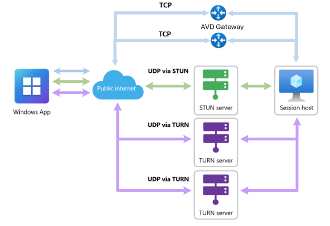 If the active transport path becomes unavailable or degraded, Azure Virtual Desktop automatically switches to the next best available UDP or TCP path. This helps maintain session continuity without requiring user reconnection.