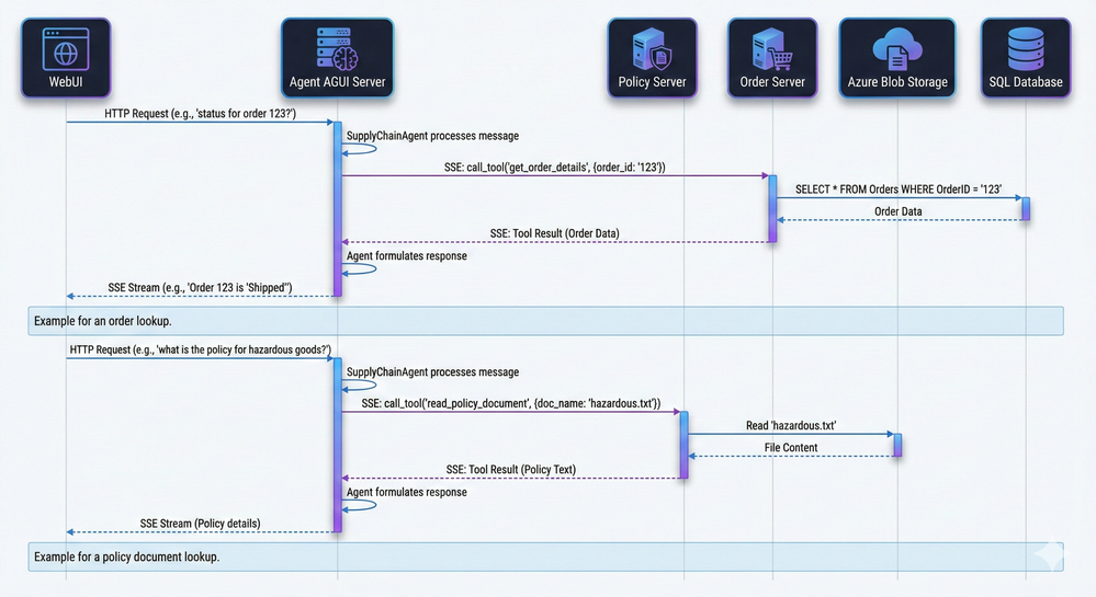 Execution: The Agent Service calls the appropriate MCP tools (Policy or Orders) via SSE and JSON-RPC.