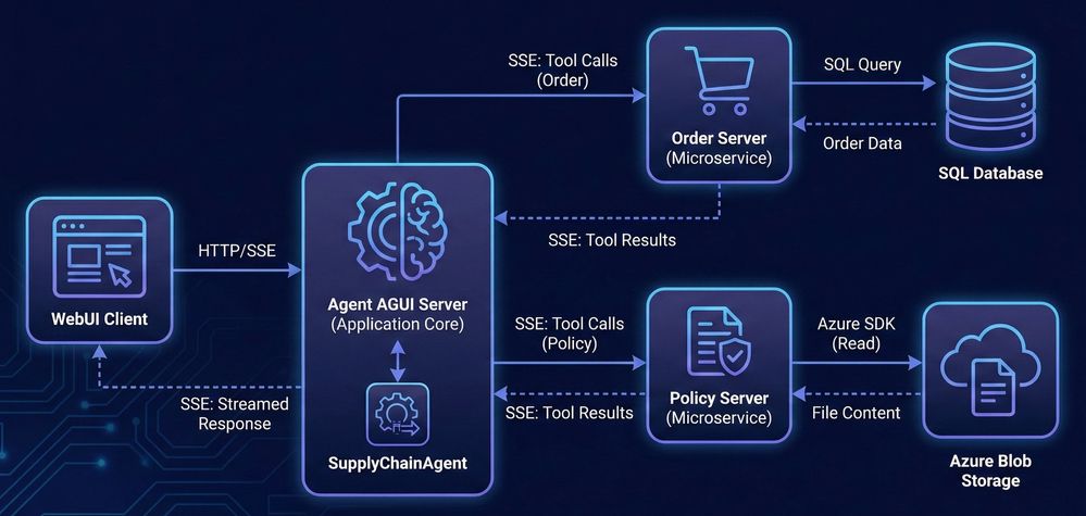 Agent + AG-UI Service (FastAPI): The core of the system, linking to the MCP servers, running the agent through the Microsoft Agents SDK, and streaming events directly to the browser.