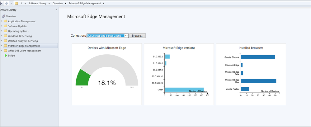 The Microsoft Edge Management dashboard provides you insights on the usage of the new Microsoft Edge and other browsers. In this dashboard, you can: