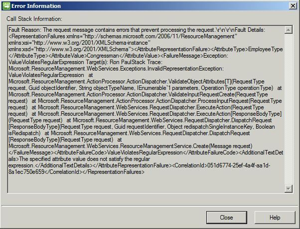 There are a few pieces of useful information buried in here. First, we see an attribute representation failure occurring for the attribute “Employee Type” which, in this case, holds a value of “Congressman”. So, we know there’s something about that value that FIM doesn’t like. Further down, nearly at the