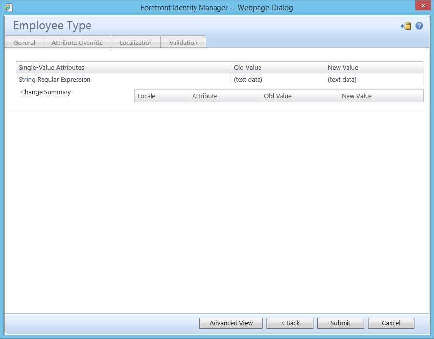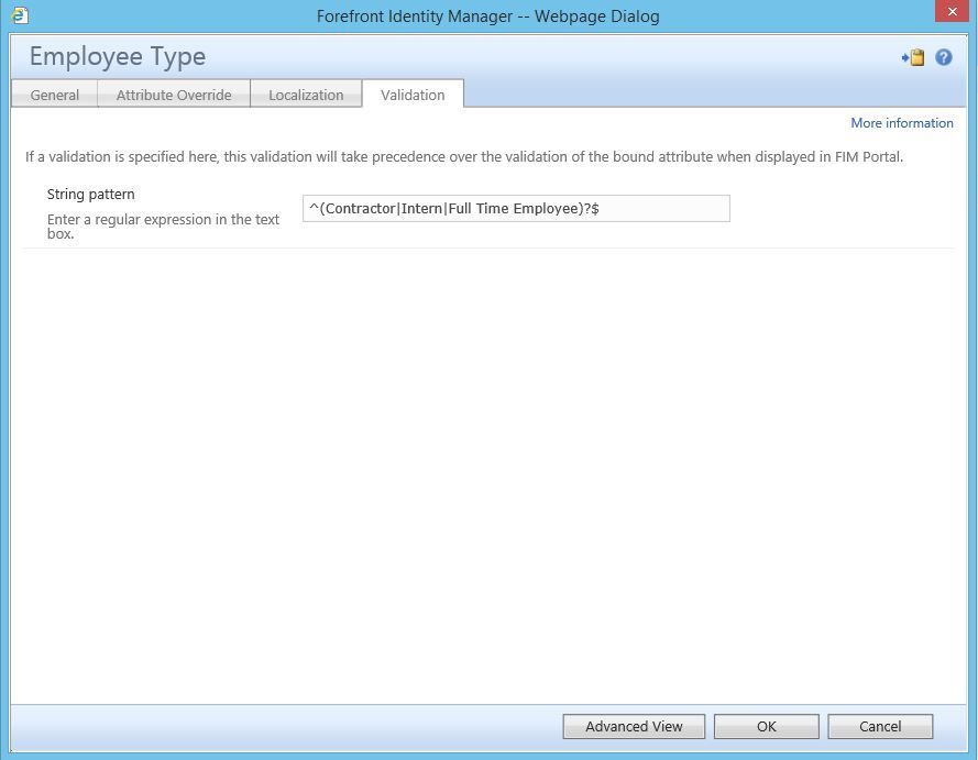 On the “Validation” tab, we see the troublesome string pattern. These are the default, out-of-box options that will be displayed in the “Employee Type” drop-down under the user view in the FIM portal.