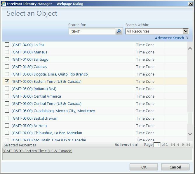 In the “Search for:” box, enter “ (GMT ” and click on the magnifying glass. This will display all available time zone resources. Find your desired time zone in the list and check the box to select it. Click “OK”.