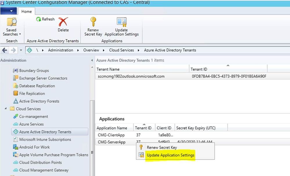 Microsoft.ConfigurationManagement.ManagementProvider.SmsExceptionFailed to update settings for the application. For more information, see SmsAdminUI.log. at Microsoft.ConfigurationManagement.AdminConsole.CloudServicesManagement.AAD.AADUtilities.RefreshAppSettings(Object sender, ScopeNode scopeNode, ActionDescription action, IResultObject selectedResultObject, PropertyDataUpdated dataUpdatedDelegate, Status status) One or more errors occurred.System.AggregateExceptionOne or more errors occurred. at System.Threading.Tasks.Task.ThrowIfExceptional(Boolean includeTaskCanceledExceptions) at System.Threading.Tasks.Task`1.GetResultCore(Boolean waitCompletionNotification) at System.Threading.Tasks.Task`1.get_Result() at Microsoft.ConfigurationManagement.AdminConsole.CloudServicesManagement.AAD.AADDataHandler.AssignAndGrantPermissionOnServerApplication() at Microsoft.ConfigurationManagement.AdminConsole.CloudServicesManagement.AAD.AADUtilities.RefreshAppSettings(Object sender, ScopeNode scopeNode, ActionDescription action, IResultObject selectedResultObject, PropertyDataUpdated dataUpdatedDelegate, Status status)System.ArgumentNullExceptionValue cannot be null.Parameter name: type