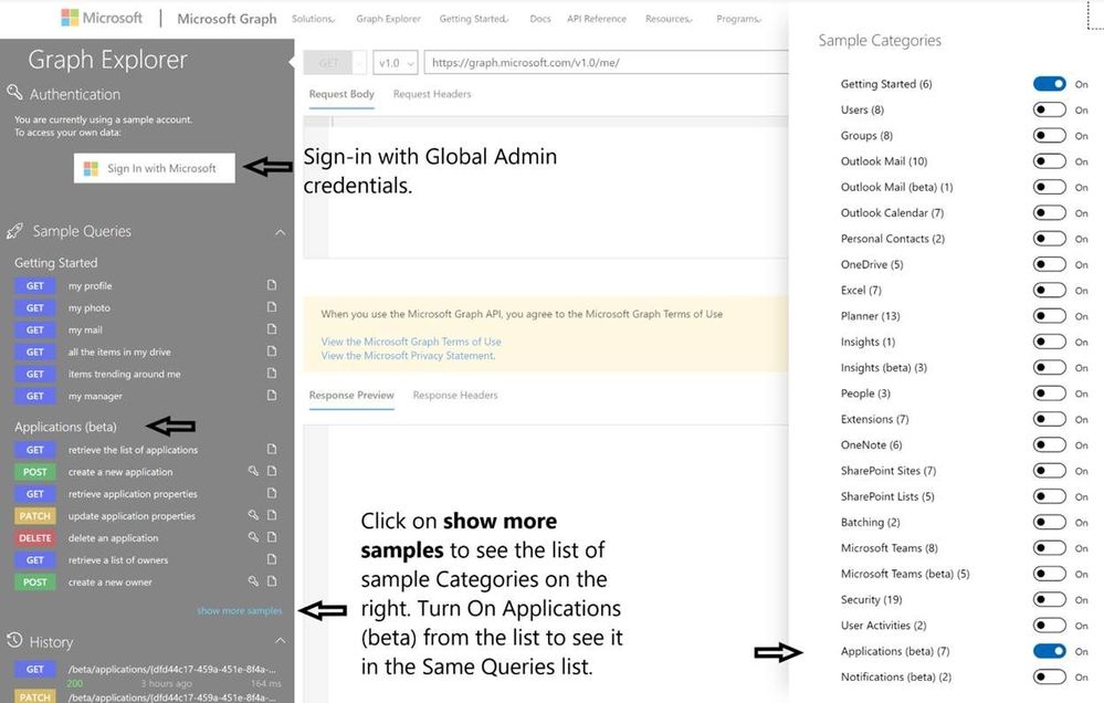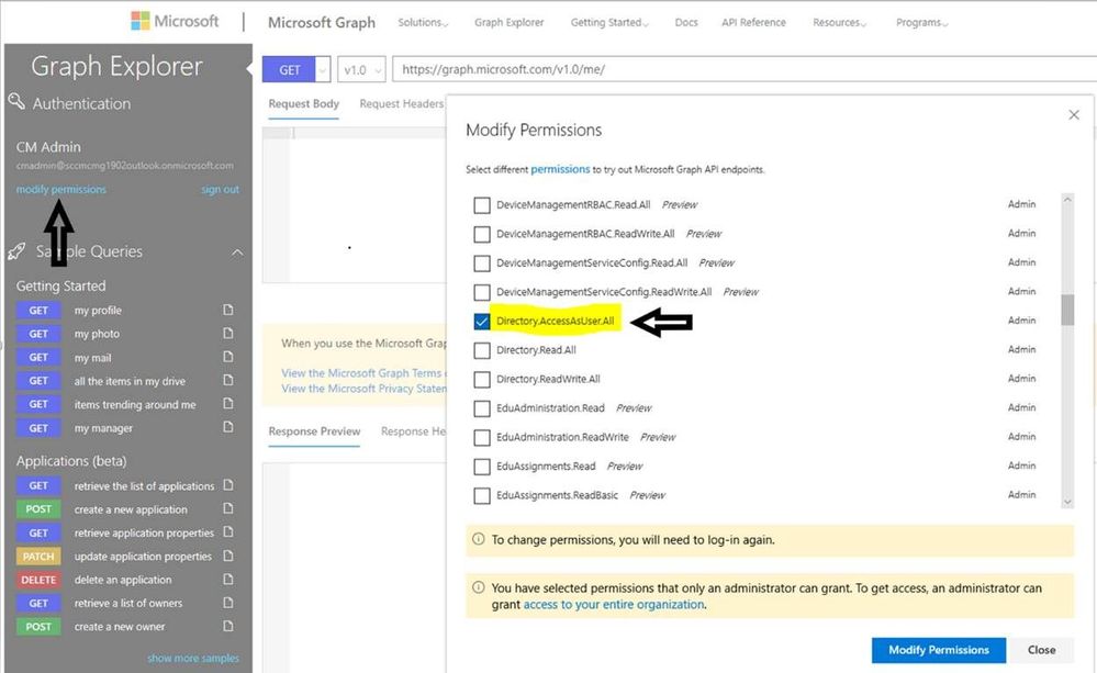 Azure Graph Explorer won't allow you to query or make changes to the App properties by default. Select modify permissions to grant Directory.AccessasUser.All permission to the Signed in user, which grants access to query and modify App properties.