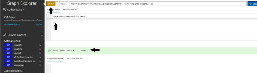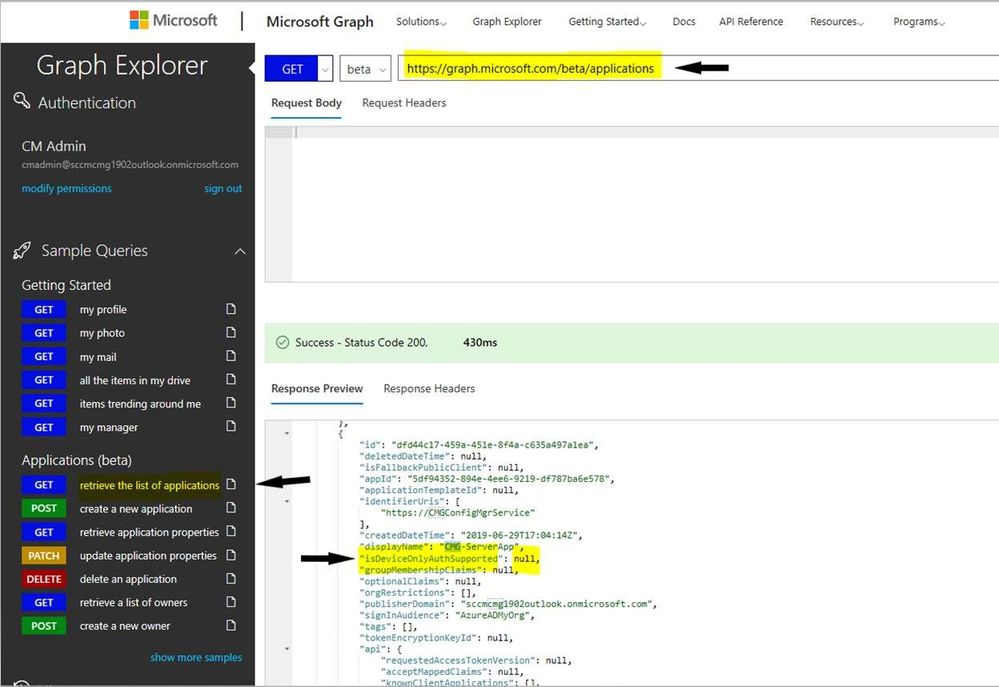 Select retrieve the list of applications from the list of queries under Applications (beta) to see the list of registered Apps. You can highlight "Response Preview" area and press Ctrl+F to search the Server App you are interested in. This may be handy when there are several Apps. The property we are interested in is isDeviceOnlyAuthSupported. If this is set to "null" as you see below, it means Device Token is not enabled.