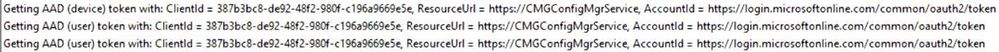 Getting AAD (user) token with: ClientId = 387b3bc8-de92-48f2-980f-c196a9669e5e, ResourceUrl = https://CMGConfigMgrService, AccountId = https://login.microsoftonline.com/common/oauth2/token ADALOperationProvider