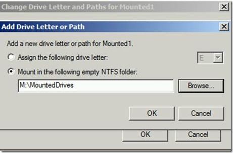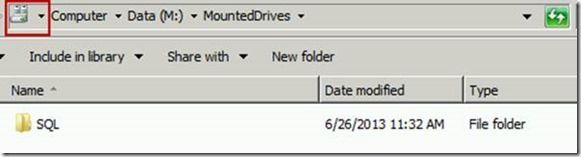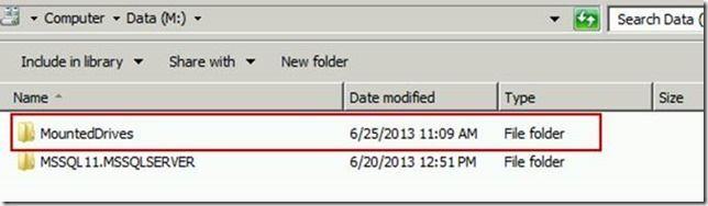 Next, I am going to go out to my M drive and create a folder to use for my mount point. There are a couple of things to make note of here. First – my M drive is a resource on my cluster. When SQL fails over from one node to another, so does my M (data) and L (log) drives. Since I am putting the mount point on a clustered resource, I ultimately have to make the mount point a clustered resource and I must make it dependent upon the SQL Server service itself. I have created a folder in my M drive named MountedDrives which I will use as an entry point for the drive I plan to mount.