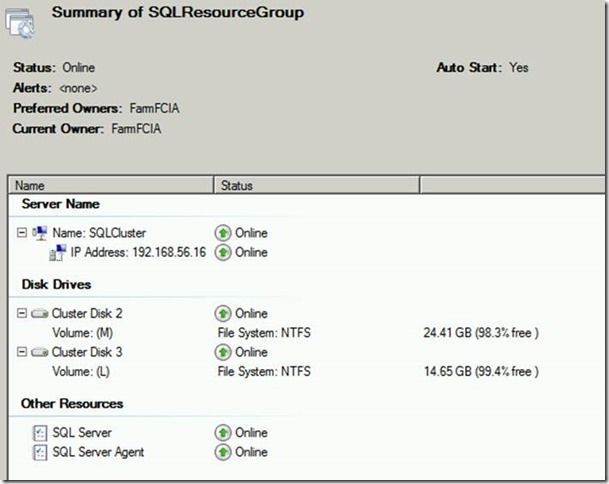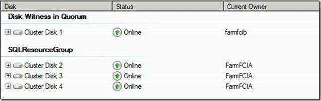 Here is what my SQL Server Failover Cluster Instance (FCI) configuration looks like. I have 2 nodes in the cluster (FarmFCIA & FarmFCIB). FarmFCIA is the current owner and my disks 2 & 3 currently belong to that node. Disk 1 (my quorum disk) is currently on node FarmFCIB.