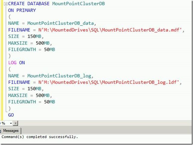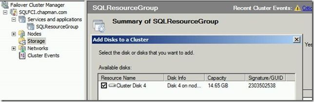 In this blog post I will look at how you can add a mount point to a http://www.microsoft.com/windowsserver2008/hr/hr/failover-clustering-overview.aspx and use that mount point for SQL Server 2005 and later installations. I already have the SQL FCI setup and configured, so at this point all I am going to do is add the mount point.