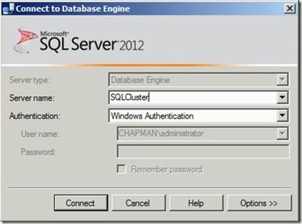 To test the new drive, I’ll connect to my cluster resource name, SQLCluster in SSMS.