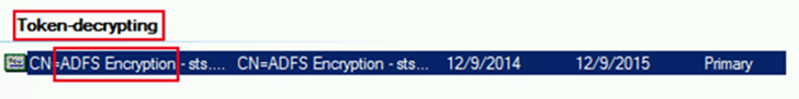 Consequently, just because you see the token decryption certificate in the ADFS console under the certificates container, doesn’t mean encryption of tokens is actually being performed. There is A LOT of confusion because of how the ADFS management console displays the self-signed certificates. It says Token-decrypting above the certificate but the CN on the certificate says ADFS Encryption .