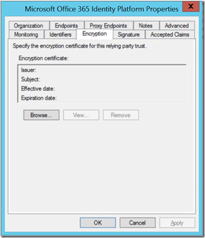 If you want to verify whether token encryption is enabled for a specific relying party application, you will have to go and look at the encryption tab on that specific relying party application. As you can see here, I don’t have an encryption certificate installed for this relying party application, so encryption will not be used.