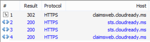 Frame 1: I navigate to https://claimsweb.cloudready.ms . It performs a 302 redirect of my client to my ADFS server to authenticate.