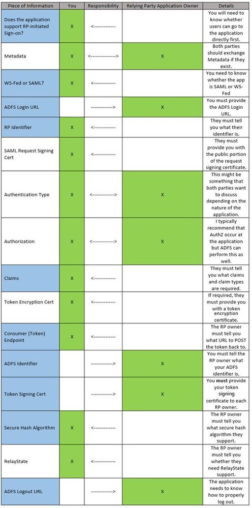 So here is a breakdown of what is needed. The following table is a summary of all the things needed to build a relying party trust and what things the relying party trust owner will need as well.