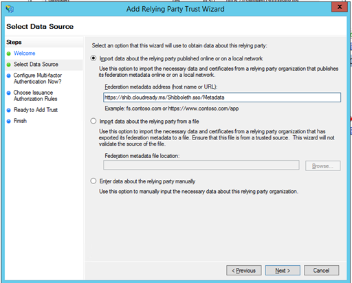 Some SSO applications may also have a metadata that you can import to create the relying party trust in ADFS. If it is available from a URL, you can just type that metadata into the RP creation wizard or import the downloaded .xml document: