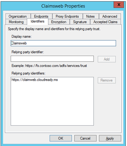 On my ADFS server, you can see that my relying party trust for claimsweb has the same identifier: