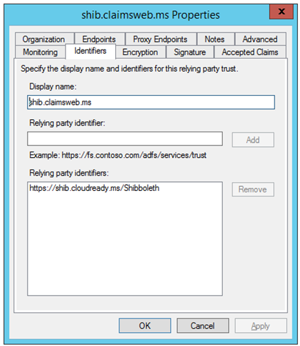 Once again, on my ADFS configuration, you can see that my SAML relying party trust has the same identifier:
