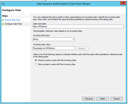 For example, we could ensure that only CloudReady.ms\HRAdmins are the only group permitted to this this claimsweb.cloudready.ms application: