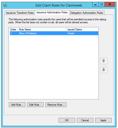 If this is my only authorization rule and I’m not in the HRAdmins group, ADFS will never get around to processing the claims and sending my browser a token because I’ll receive Access Denied right up front: