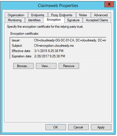 Next, ADFS needs to know whether the application requires the SAML token be encrypted. If so, the application owner must provide you with the public portion of their token encryption certificate. Most applications don’t require token encryption since the token is protected by SSL and has a digital signature associated with it but if one is required, your relying party trust must have it configured: