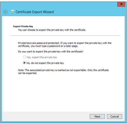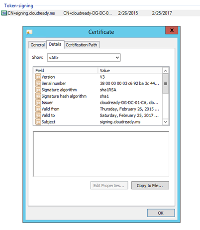 One of the first things the application does is check the digital signature of the token not only to ensure who the token came from but also ensure it wasn’t modified in transit. To properly do this, the application must have the public portion of the ADFS server’s token signing certificate. Every application must have a copy of the ADFS server’s token signing certificate. Some applications will accept this certificate in .cer format while others require .pem format. Applications based off of the Windows Identity Foundation (WIF) only need the thumbprint of the certificate pasted into their web.config. To export the token signing certificate from ADFS, open up the certificates container, go to the properties of the token signing certificate and then to the details tab and at the bottom, you see “Copy to File”: