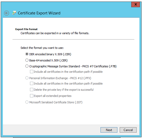 If they want it in .CER format, select the DER encoded binary X.509. If they want it in .PEM format, select the Base-64 encoded X.509.