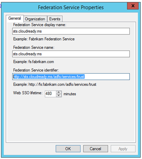 In this case, the issuer was http://sts.cloudready.ms/adfs/services/trust . The SSO application must have this ADFS identifier in its configuration. You can view your ADFS identifier by left clicking on the Service container at the root of the ADFS console and then right click>Edit Federation Service Properties: