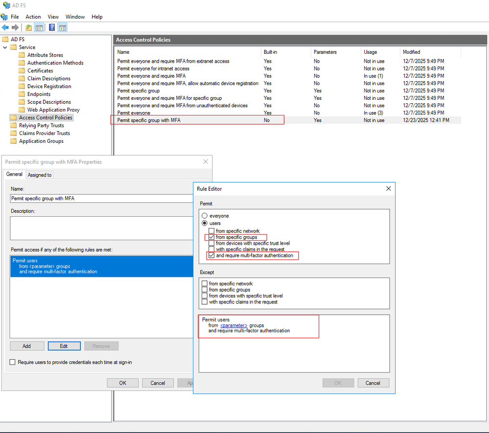 Putting it all together our rule would look like: exists([Type == "http://schemas.microsoft.com/ws/2008/06/identity/claims/groupsid", Value == "S-1-5-21-3755518198-905394505-1163020732-513"]) && NOT exists([Type == "http://schemas.microsoft.com/ws/2008/06/identity/claims/groupsid", Value == "S-1-5-21-3755518198-905394505-1163020732-15115"]) => issue (Type = "http://schemas.microsoft.com/ws/2008/06/identity/claims/authenticationmethod", Value = "http://schemas.microsoft.com/claims/multipleauthn"); Now that I knew the claims rules I wanted to use I just had to figure out how to get them into ADFS. In the ADFS GUI there is no way to directly edit the rules so PowerShell to the rescue! Since I was using PowerShell I started using variables. My rule then looked like this: $GroupAddMFA = Get-ADGroup "domain users" $GroupAddNoMFA = get-adgroup "no MFA for these users" $GroupMfaClaimTriggerRule = 'exists([Type == " http://schemas.microsoft.com/ws/2008/06/identity/claims/groupsid ", Value == "' + $groupAddMFA.SID.Value + ' "]) && NOT exists([Type == " http://schemas.microsoft.com/ws/2008/06/identity/claims/groupsid ", Value == "' + $groupAddNoMFA.SID.Va lue + ' "]) => issue (Type = " http://schemas.microsoft.com/ws/2008/06/identity/claims/authenticationmethod ", Value = " http://schemas.microsoft.com/claims/multipleauthn ");' I wanted to add these rules to the relying party trust for O365, so I put that object into a variable too. $rp = Get-AdfsRelyingPartyTrust -name "Microsoft Office 365 Identity Platform" Before I actually modified the rules I had to remove the groups from the "Global Multi-Factor Authentication Policy", but leave the checkbox enabling the MFA provider. Now I had to add my ruleset to the "Additional Authentication Rules" for my relying party trust: Set-AdfsRelyingPartyTrust –TargetRelyingParty $rp –AdditionalAuthenticationRules $GroupMfaClaimTriggerRule Once I set this up all the users in my lab domain were forced to use MFA, except for those uses in the "No MFA for these users". Even better news is that in Server 2016 we should be able to accomplish all this via the "Access Control Policies" GUI directly: I hope this blog post helps to explain by example some simple ADFS claims rules and how to load those rules into ADFS 3.0 as well as something to look forward to in Server 2016.