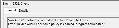 In September 2017 Rollup there where some changes to Device Guard which increase teh Overall security of your System. As a result the way how our SyncAppVPublishingServer.exe does it work no longer works.
