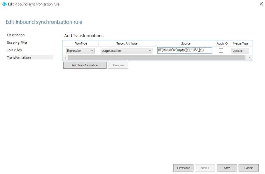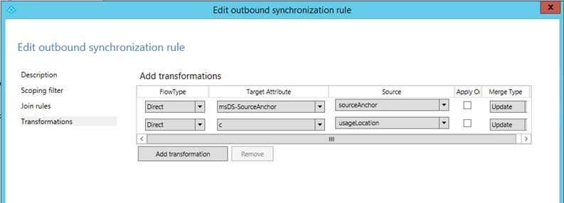 In the Transformations tab, Add Transformation "Direct" target: C – Source: UsageLocation, Merge Type: Update.