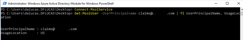 Check the user: Get-MsolUser -UserPrincipalName user@domain.com | fl UserPrincipalName, UsageLocation