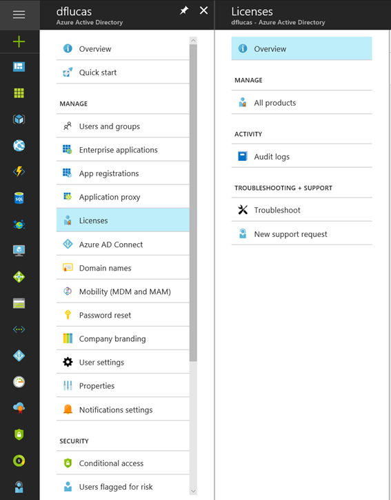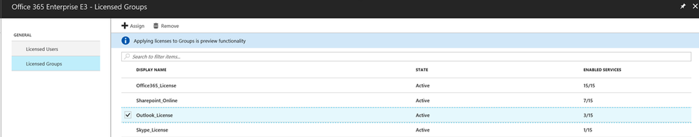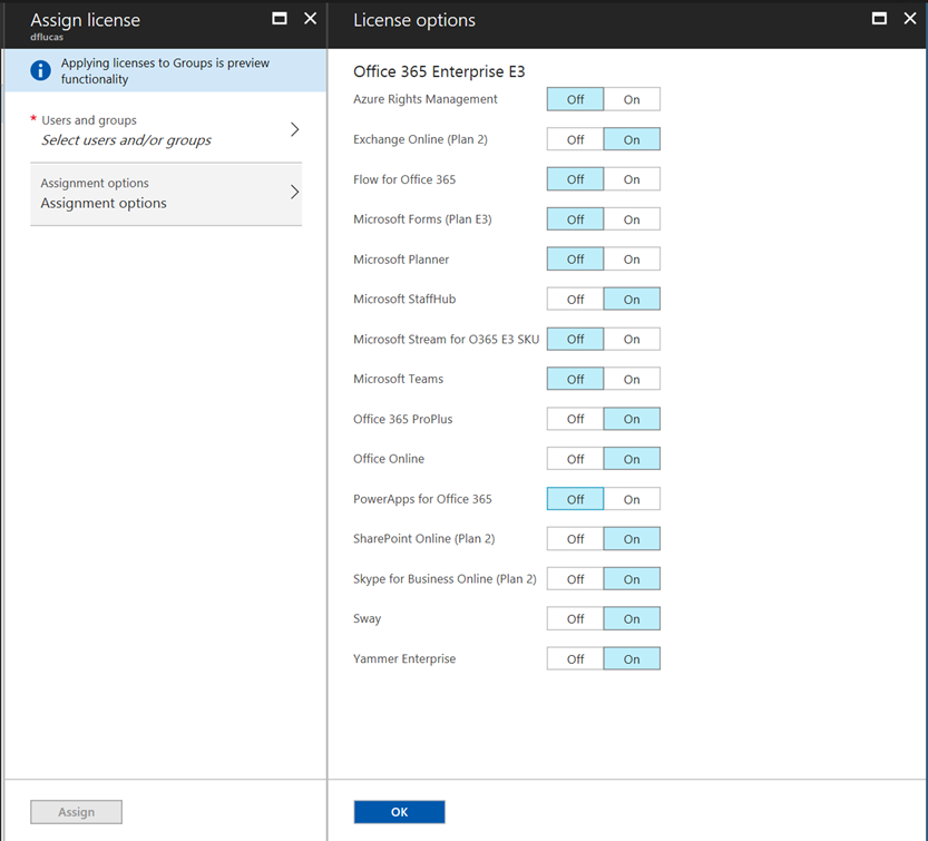Assign Office 365 License based on Groups : First, in this example, I created in my on-premises Active Directory, 3 security groups to select different Office 365 products: 1 – Outlook_License 2 – Skype_License 3 – Sharepoint_License After created, force a new Sync Cycle, and check in the Azure Portal if the Groups are populated. In the Azure Portal portal.azure.com , select the Azure Active Directory , then select " Licenses ". Under All Products , select Office 365 Enterprise E3 . Under Licensed Groups , select the Group that you want to assign Under Assignment Option , select which Products will be available for the Group. Now, you just need to populate your groups, and wait the Azure AD to assign the Licenses. Note: When a user is a part of two or more groups, the user will inherit the licenses combined and all products will be available for the user. If you want to know, how is the correct country code for my user, here is the information: https://en.wikipedia.org/wiki/ISO_3166-2 If you experience an error like “object reference is not set to an object”. Put “anything” in the tag field in the first screen and it will work. For more examples in how to assign group licenses using Powershell: https://docs.microsoft.com/en-us/azure/active-directory/active-directory-licensing-ps-examples Hope that this article helps you. Daniel Lucas.