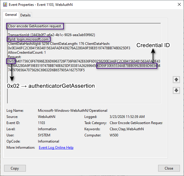 | Therefore, Cbor decode GetAssertion response events (Event ID 1104) will tell you which users successfully authenticated to the Windows device using a FIDO2 security key. |